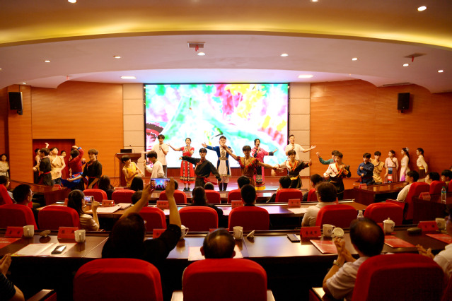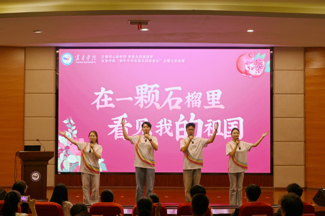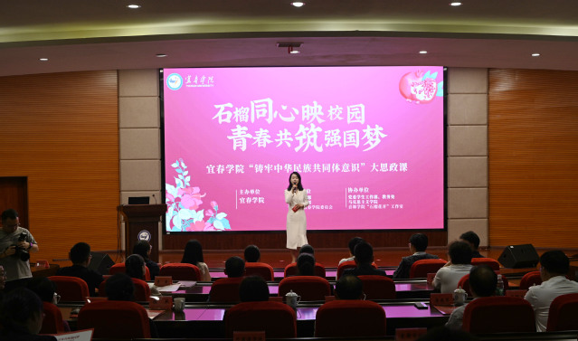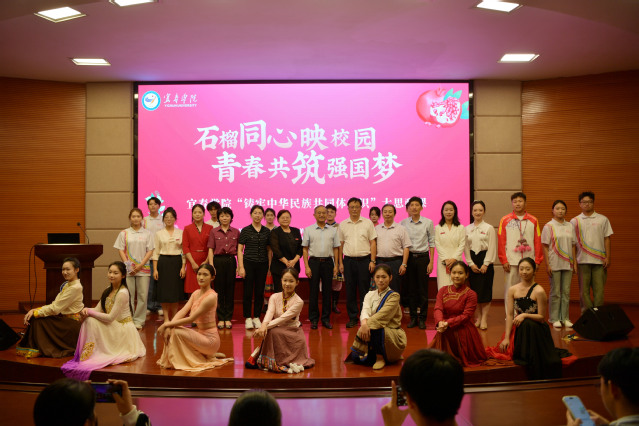 本站讯(记者 何杰 学生记者 乐特)秋光正好,桂香满径,校园里成行的香樟树舒展着翠绿枝叶,交织成一片生机盎然的绿荫,恰似各族儿女并肩同行的美好模样。10月14日,宜春学院以“石榴同心映校园 青春共筑强国梦”为主题,举办“铸牢中华民族共同体意识”大思政课活动。宜春市教体局副局长陈燕,校党委书记李国金,校党委委员、副校长余新卫,校党委委员、副校长李建军等领导嘉宾,与各职能部门负责人、师生代表齐聚一堂,在鲜活故事、深情表达与互动体验中,让“铸牢中华民族共同体意识”的种子扎根青春心田。