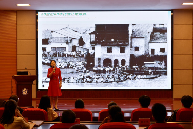 “单桨难渡江河,万橹共划沧海!”随着谌琪老师的讲述,活动视角转向龙舟这一承载中华民族精神的文化符号。从明清时期袁河流域的龙舟习俗,到贵州苗族独木龙舟、西双版纳傣族彩纹龙舟、新疆伊犁跨民族龙舟赛,再到我校学子组成的江西队在全国少数民族传统体育运动会斩获佳绩——一幅幅多元多彩的龙舟图景,展现了“各美其美,美美与共”的文化包容。