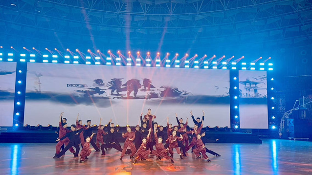 最后登场的《花火绽放》是舞蹈表演专业与宜春三中的跨界合作之作,以健美操为核心形式,生动诠释“青春如焰,向阳而生”的主题。在表演者中,既有体育学院擅长体能与动作编排的学子,也有宜春三中充满活力的青少年,他们身着统一的荧光色运动服,在舞台灯光的映衬下如同“流动的花火”。节目以“蓄力—绽放”为脉络,初始时表演者以低姿律动模拟“花火蓄力”,随后通过同步的跳跃、托举、队形散开,展现“花火升空”的动感;最终全员以高难度的集体造型定格,手臂舒展如绽放的火焰,与场馆内的灯光交相辉映,将现场氛围推向高潮。