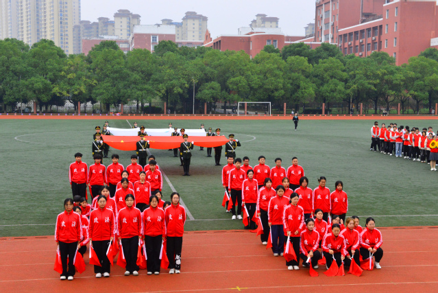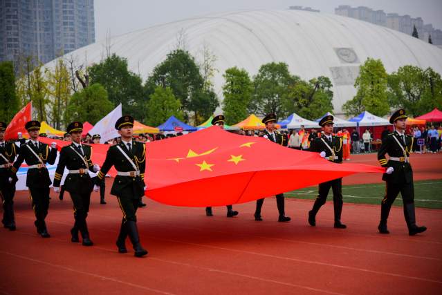 激昂的《运动员进行曲》奏响,国旗护卫队队员身着笔挺制服,以铿锵步伐护送五星红旗入场,鲜红旗帜猎猎飘扬,尽显青年学子的蓬勃朝气。紧随其后的会旗队,手举象征公平团结的校运会会旗,传递着“更快、更高、更强、更团结”的奥林匹克格言。鲜花队手捧缤纷花束,步履轻快充满活力;彩旗队挥舞五彩旗帜,似流动彩虹,将赛场氛围渲染得热烈非凡。