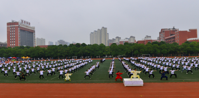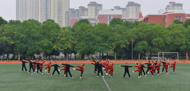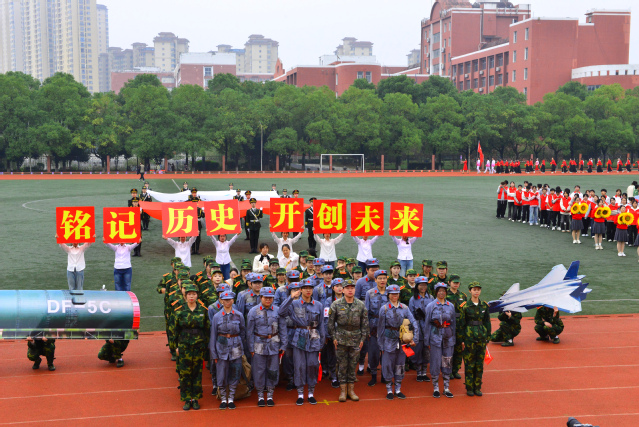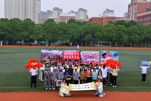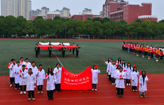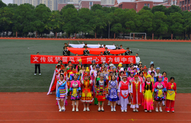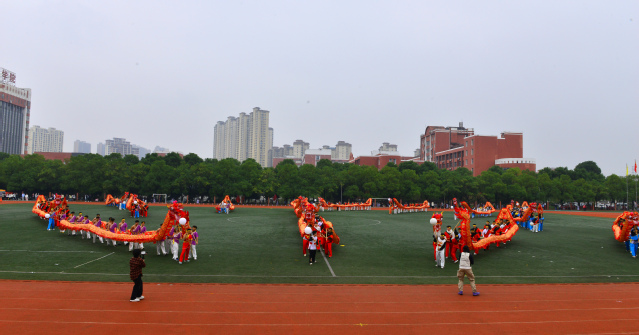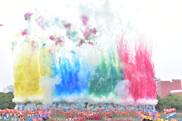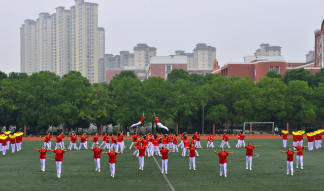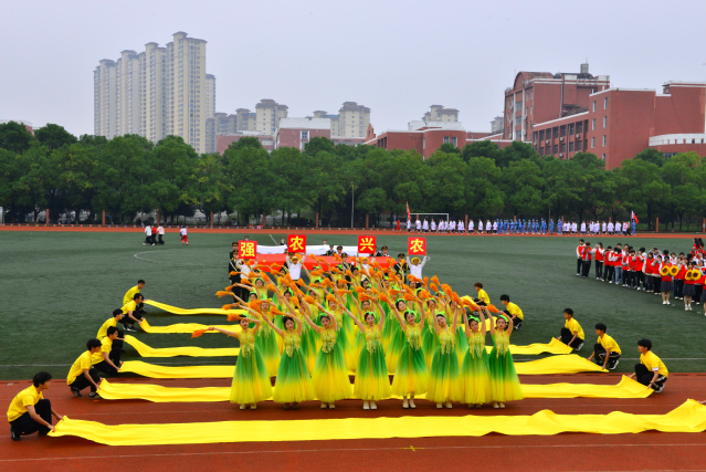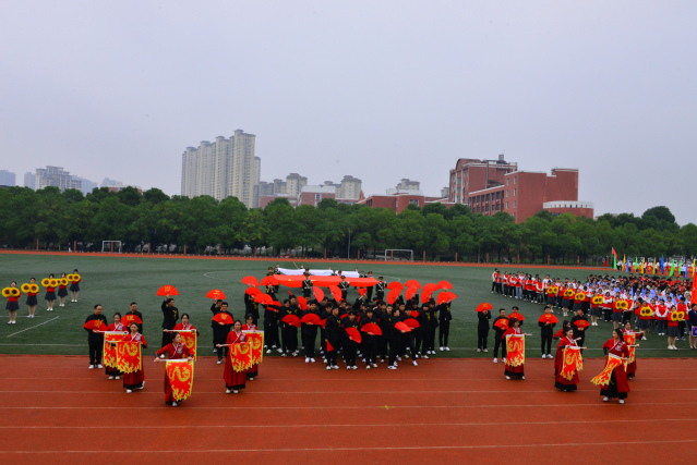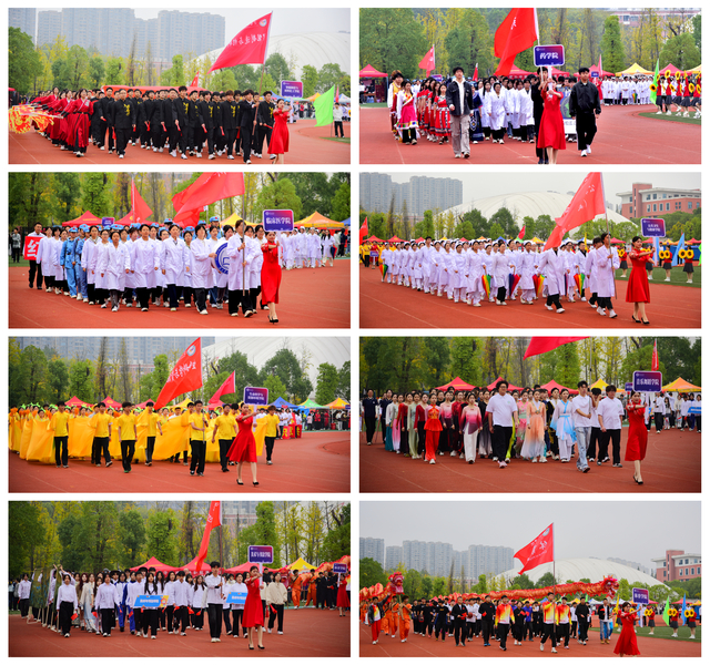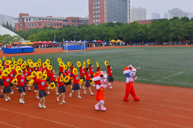 随后,青年志愿者方阵满怀热忱入场,志愿服像燃烧的火炬,是他们奉献精神的写照;裁判员方阵着装统一,神情肃穆,彰显公正执裁的专业风范;教职工方阵步伐稳健,尽显师者气度;研究生方阵意气风发,传递着学术与运动兼具的活力;各教学院方阵创意迭出——国际教育学院学子身着汉服,尽显文化交融之美;外国语学院演绎“革命战士”与军训学生跨时空相遇,发出“正义必胜、和平必胜”的宣言;经济与管理学院学子动作明快且富有韵律,将传统民俗元素与现代表演形式巧妙融合;生命科学与资源环境学院在金色麦浪中洋溢着丰收的喜悦......各方阵嘹亮口号此起彼伏,赢得现场观众阵阵掌声。