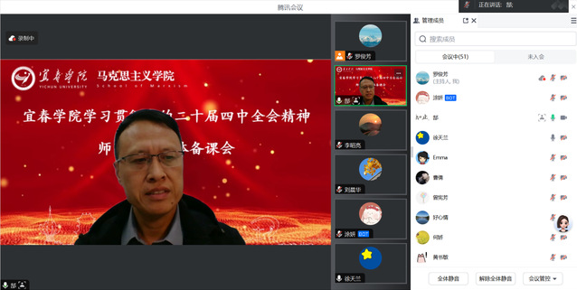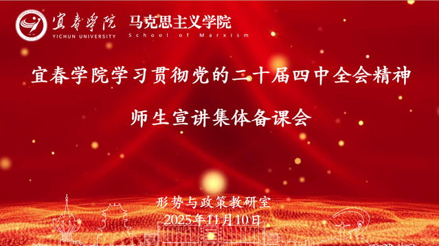 本站讯(通讯员 李小芳)为进一步全面深入学习贯彻党的二十届四中全会精神,用党的创新理论武装学生头脑,我校于11月10日晚在线上举行了学习宣传党的二十届四中全会精神师生宣讲集体备课会。会议邀请江西科技师范大学马克思主义学院院长郜志刚教授作教学指导,学校各二级学院负责宣讲专题的领导、老师,马院院长、书记李霞,副院长代祥,马院“形势与政策”教研室全体老师及部分教师、学生代表参加,会议由“形势与政策”教研室主任袁佳玉主持。