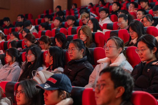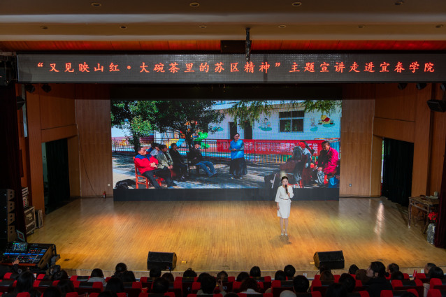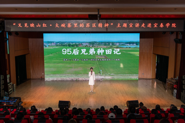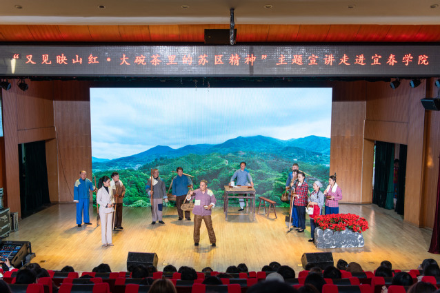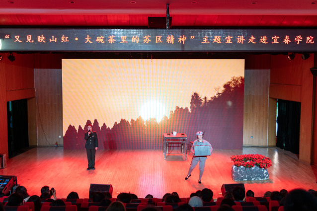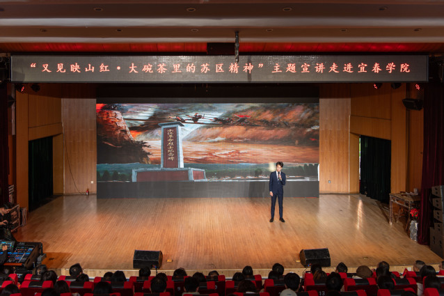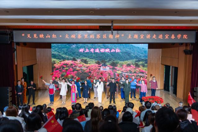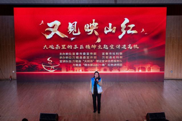 本站讯(记者 何杰 实习记者 朱世弘)11月28日,艺术楼演奏厅内红歌嘹亮,一场以“又见映山红·大碗茶里的苏区精神”为主题的宣讲会在此举行。活动以“沉浸式宣讲 + 地方非遗艺术”的创新形式,通过“英雄茶、将军茶、愚公茶、冠军茶”四道大碗茶,串联起四个镌刻着苏区精神的动人故事,让红色基因在师生心中深深扎根。全省“四个100”宣讲导师、省委党校社科(政治学)教研部负责人傅慧平,市新闻工作者协会专职副主席刘振坤,万载县县委常委、宣传部部长黄云辉,校党委书记李国金出席活动。两百余名师生到现场观看。