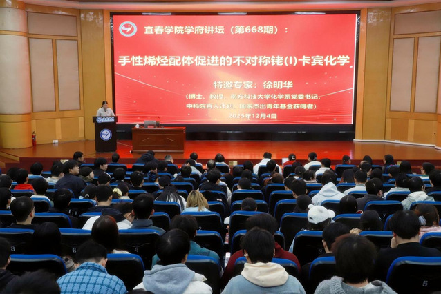 本站讯(智能制造与材料化工学院 供稿)12月4日下午,宜春学院“学府讲坛”(第668期)学术报告会在主教楼三楼学术报告厅成功举办。本期讲坛特邀南方科技大学化学系党委书记、国家杰出青年科学基金获得者徐明华教授,作题为“手性烯烃配体促进的不对称铑(I)卡宾化学”的学术报告。报告会由智能制造与材料化工学院党委书记龙玲主持,学院在家班子成员、相关专业师生及学生代表共三百余人聆听了报告。