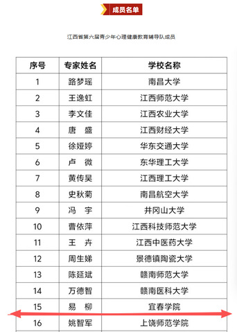 本站讯(学工处 供稿)近日,由江西省文明办、江西省教育厅、江西省卫生健康委员会、江西省关心下一代工作委员会共同组织开展的江西省第六届心理健康“百场辅导进百校”主题实践活动选拔结果揭晓,我校心理健康教育与咨询中心专职教师易柳老师成功入选“江西省第六届青少年心理健康教育辅导队”。据悉,此次活动面向全省286名自主报名的教师进行选拔,最终遴选出40名业务能力强、教学效果好、热心公益的心理健康教育教师。