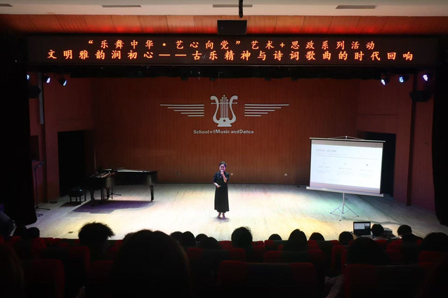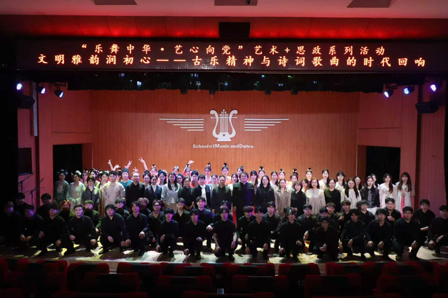 本站讯(音乐舞蹈学院 供稿)为深入推动“艺术+思政”教育融合创新,4月14日晚,宜春学院音乐舞蹈学院在艺术楼音乐厅举办“乐舞中华·艺心向党”艺术+思政主题活动首场演出——《文明雅韵润初心——古乐精神与诗词歌曲的时代回响》。活动采用“微党课+主题音乐会”的形式,将理论阐释与艺术展演有机融合,为师生带来一堂生动的“舞台上的思政课”。