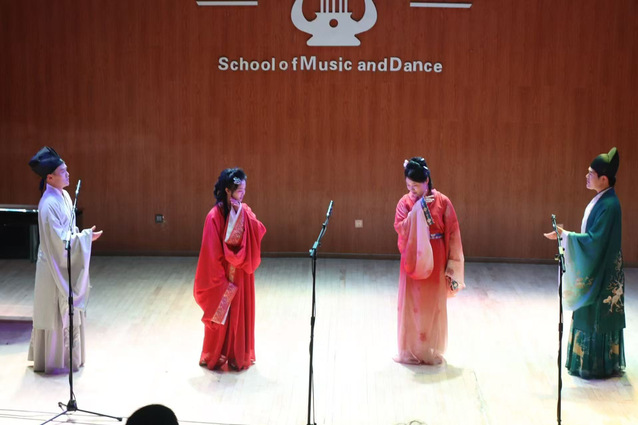 微党课结束后,主题音乐会随即上演。节目紧扣党课所传递的精神脉络,将“修身、齐家、治国、平天下”的理念转化为可听可感的艺术表达。男女声二重唱《越人歌》、古筝齐奏《临安遗恨》、双人舞《锦瑟》、女声小组唱《红豆词》、琴歌《阳关三叠》、群舞《唐印》及大合唱《精忠报国》等节目依次登场,涵盖声乐、器乐、舞蹈等多种形式。师生以精湛技艺和饱满情感,将古乐精神与诗词歌曲中的家国情怀娓娓道来,赢得现场观众阵阵掌声。